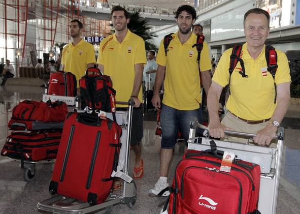 José Manuel Caldeón, Rudy Fernández, Berni Rodriguez y el seleccionador Aito García Reneses sonríen tras llegar al aeropuerto internacional de Pekín
