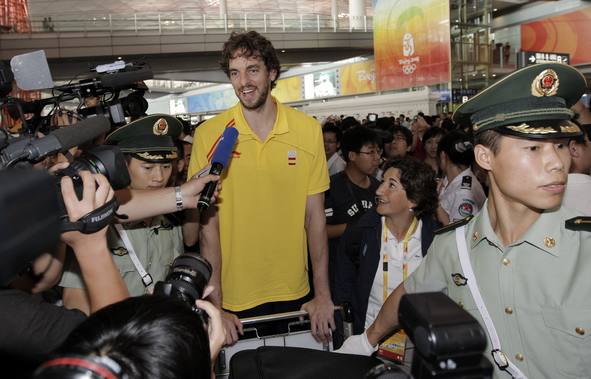 El jugador español Pau Gasol da declaraciones a la prensa tras llegar al aeropuerto internacional de Pekín.
