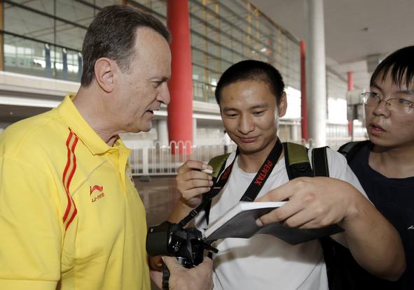 El seleccionador español de Baloncesto Aito García Reneses conversa con periodistas a su llegada a Pekín.