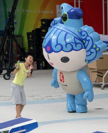 Una joven enseña a bailar a Beibei, la mascota pez, en el Centro Acuático Nacional.