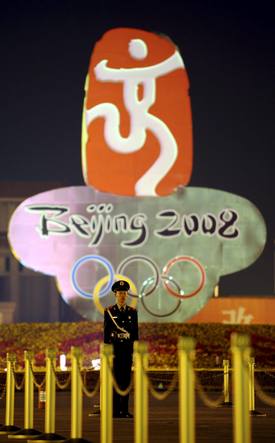 Un policía paramilitar vigila delante de un logotipo de las Olimpiadas de Pekín