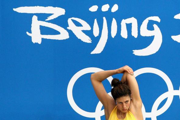 La nadadora australiana Stephanie Rice se prepara para iniciar una sesión de práctica en el Centro Acuático Nacional