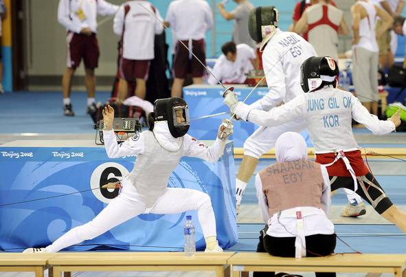Los tiradores surcoreanos Gil Ok Jung y Hyun Hee Nam se entrenan en el centro de preparación de esgrima en Pekín